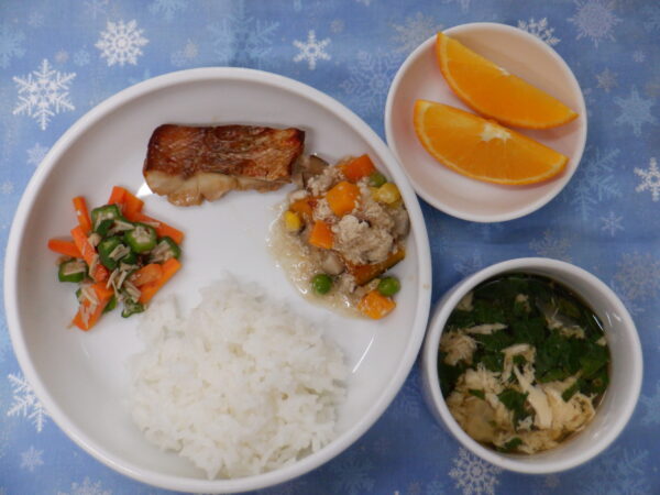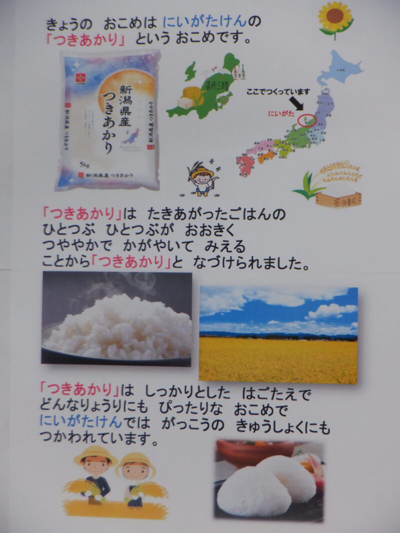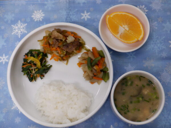 今日は 卵・小麦・乳製品などのアレルギー食材を使用していない                  全員が同じものを食べることができる給食です。