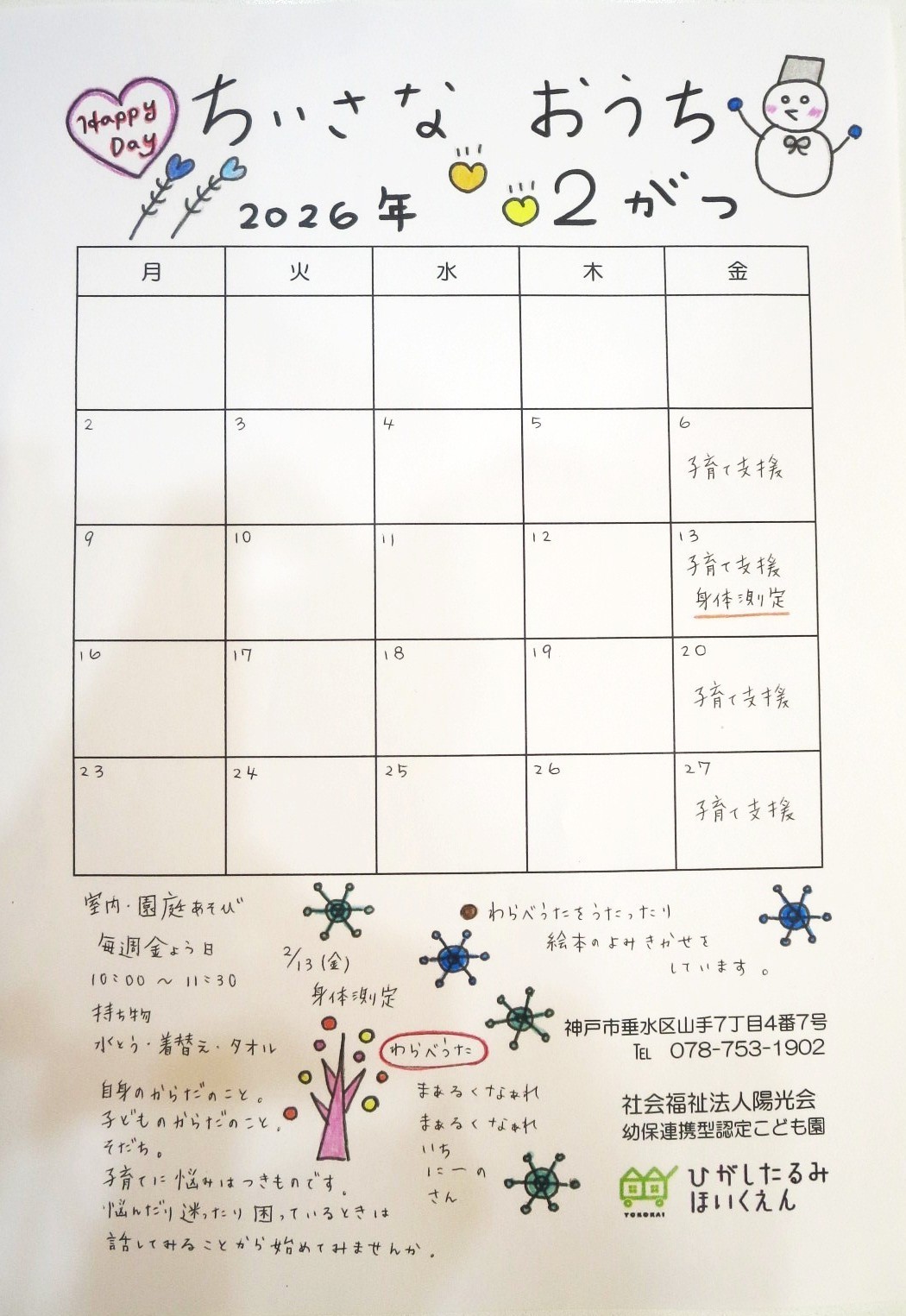 1日5組(0歳児~5歳児)までとなりますので、事前にご希望日をお電話(078-753-1902)にて